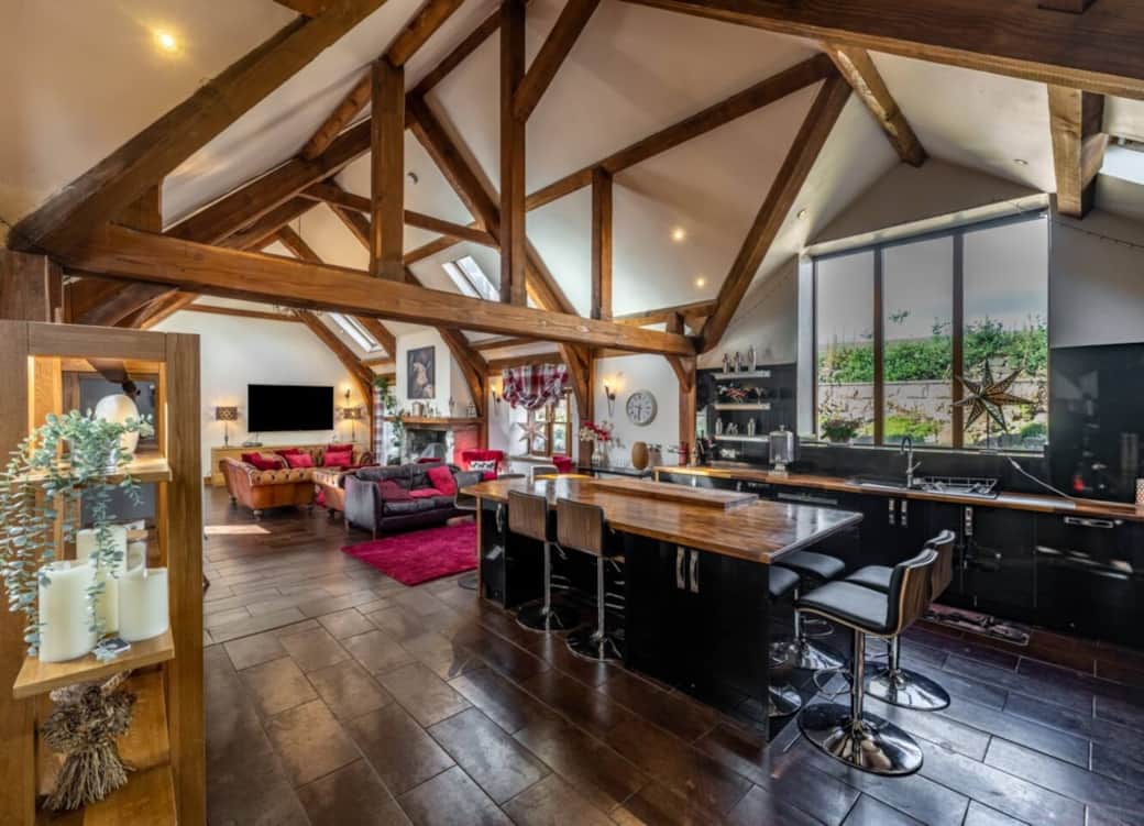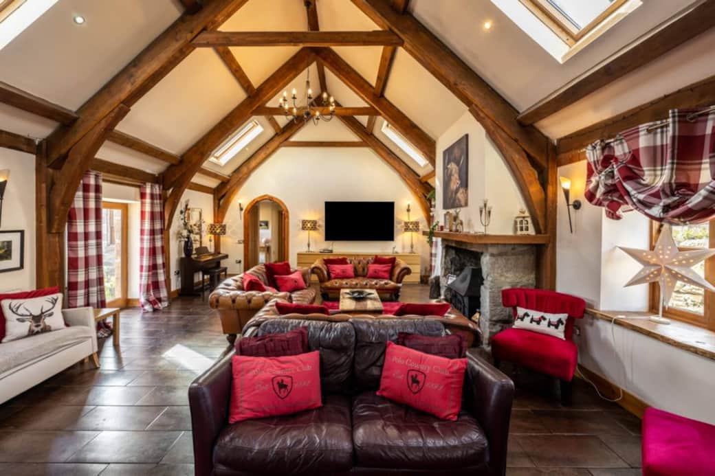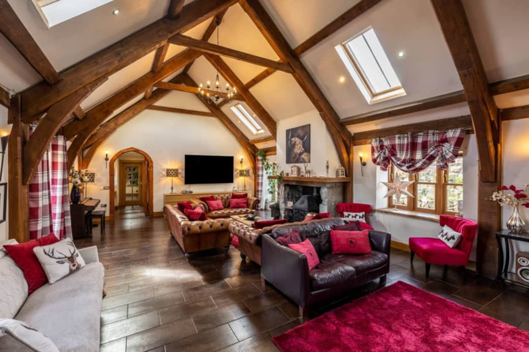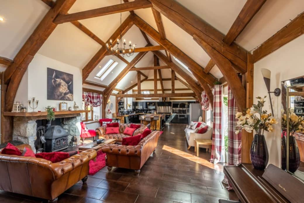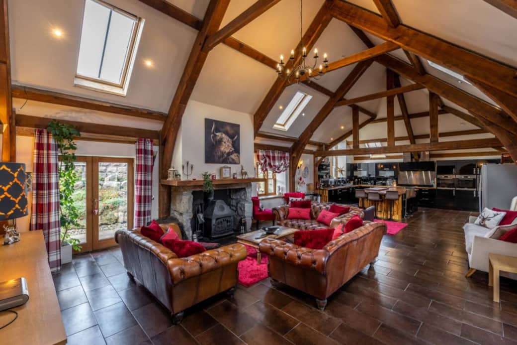 85 inch smart TV, wood burning stove and vaulted open plan ceilings